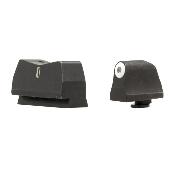 The rear sight features a V-notch design with a vertical tritium bar in the center, edged by a white border. This layout helps the shooter maintain alignment by creating a simple, intuitive “dot-the-i” sight picture: the front dot aligns inside the rear “bar,” forming a visual “i” shape.